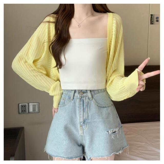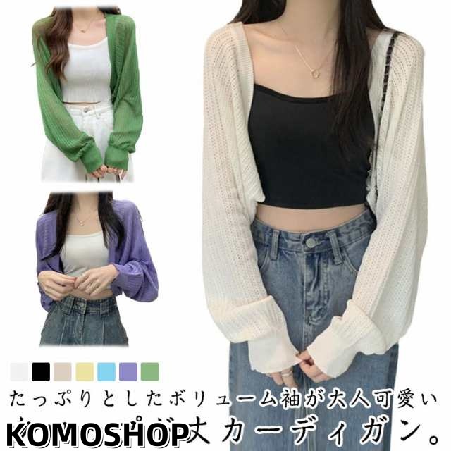 ボレロ風 サマーカーディガン バルーンスリーブ カーディガン 可愛い 透かし編み サマーニット 透け感 シアー カーディガン シースルー ショート丈 ニットカーディガン レイヤード