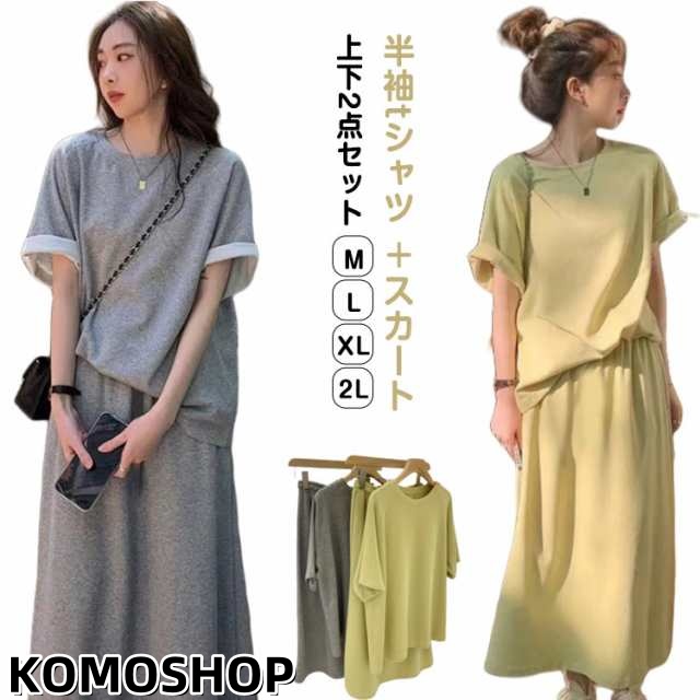 ルームウェア セットアップ 上下セット レディース 半袖 セットアップ tシャツ スカート 膝下スカート 無地 ロング丈 カットソー オーバーサイズ カジュアル