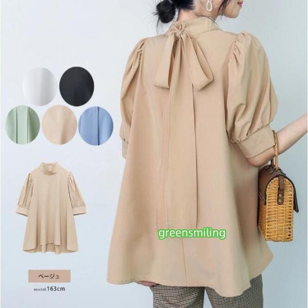 ブラウス レディース 半袖 パフスリーブ ノーカラー ハイネック リボン フォーマル 春夏 パフスリーブリボンフレアブラウス