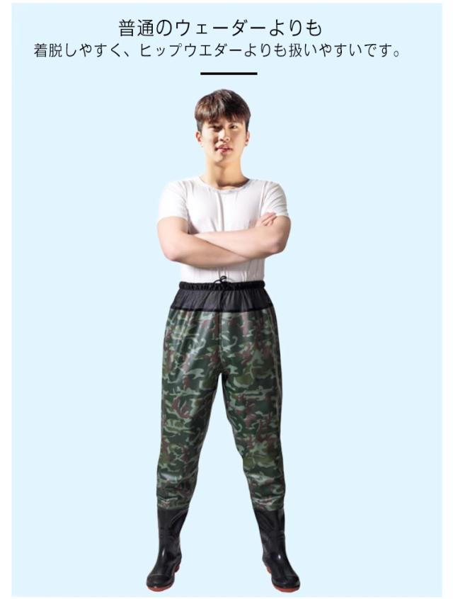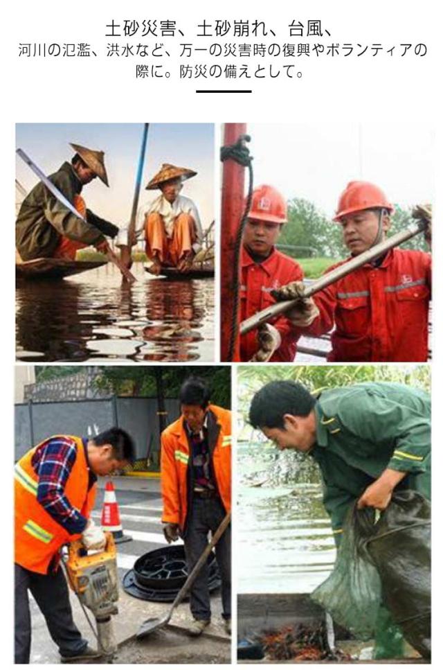 | 腰下までしか浸からないなら脱ぎ履きのしやすいウエストタイプがおすすめ。 普通のウェーダーよりも着脱しやすく、ヒップウエダーよりも扱いやすいです。 履き心地の良いPVCで作られて、柔らかくて通気性・防汚性、耐久性に優れたこだわりの仕上がり! ウエストゴムと調節可能な紐付きでウエストにフィット。 ソールはグリップのいい深溝のラジアル底で、船上でも使え、スパイクとは違って音も少なく、床を傷つける事もありません。 女性も男性も着れる小さいサイズから大きいサイズまで揃いました。 土砂災害、土砂崩れ、台風、河川の氾濫、洪水など、万一の災害時の復興やボランティアの際に。防災の備えとして。 | |