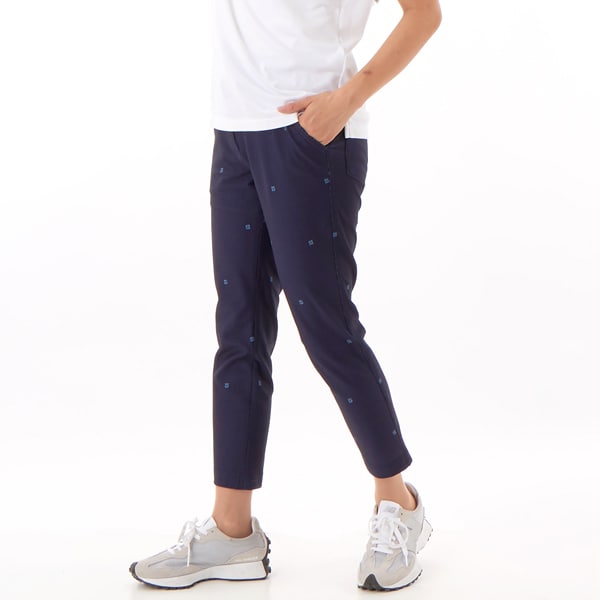 ドット刺繍が上品な印象のストレッチパンツ♪立体的なサッカー素材でサラっと爽やかな着心地です。ストレッチ性抜群で、アクティブな動きへの対応力◎