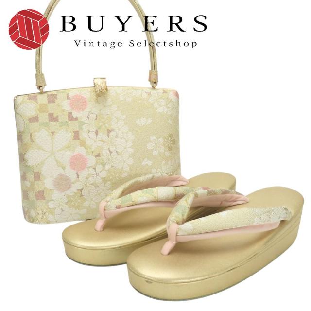 中古 和装バッグ 草履バッグセット 正絹(金銀糸除く) 合成皮革 ゴールド ゴールド金具 振袖 フォーマル 桜 和装 呉服 和服 きもの レディース 女性