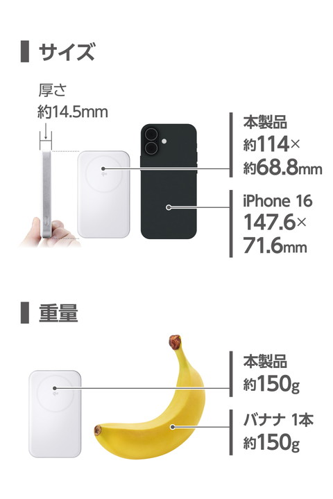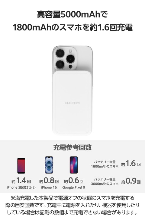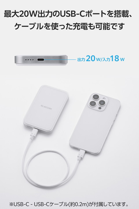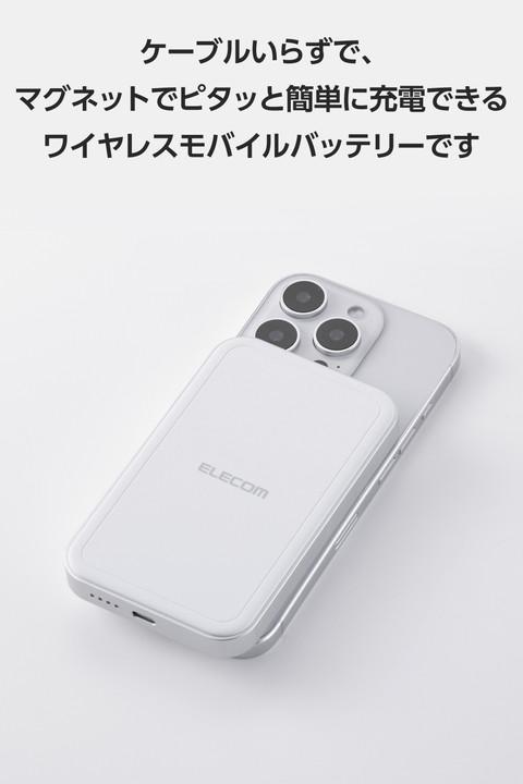 ケーブルいらず!マグネットでピタッと簡単充電!Qi2対応iPhoneに取り付け、最大15Wのワイヤレス充電ができるモバイルバッテリーです。マグネットで背面にぴったりくっつくため、ワイヤレス充電中のスマートフォン操作も楽にできます。![]() ■Qi2対応iPhoneにマグネットで取り付け、最大15Wでワイヤレス充電できるモバイルバッテリーです。 ■強力なマグネットでスマートフォンをしっかり吸着。コイル位置がぴったり合い効率よく充電できます。 ■※iPhone12以降のMagSafe対応したiPhoneおよび、Qi2規格のマグネット固定に対応した機器のみに対応しています。 ■※ケースを外した状態、またはワイヤレス充電とマグネット固定に対応したケースを装着した状態でご利用ください。 ■本製品は、電磁誘導技術を活用したワイヤレス充電の規格である「Qi(チー)2」に準拠しており、同規格に準拠した機器と互換性があります。 ■※機器によってはうまく動作しない場合があります。本製品および、ご使用になる機器の取扱説明書をよくお読みください。 ■最大20W出力のUSB Type-C(TM)ポートを1ポート搭載。通常のモバイルバッテリーとしてケーブルを使って充電が可能です。 ■※USB Type-Cポート+Qi2ワイヤレス充電を同時に使用した場合、単独使用より充電に時間がかかることがあります。 ■本製品(バッテリー容量5000mAh)で、1800mAhのスマートフォンを約1.6回、3000mAhのスマートフォンを約0.9回充電可能です。 ■※満充電した本製品のUSB Type-Cポートからの充電した場合の目安です。 ■※満充電した本製品で電源オフの状態のスマートフォンを充電する際の目安回数です。充電中に電源を入れたり、機器を使用したりしている場合は記載の数値まで充電できない場合があります。 ■※ワイヤレス出力を使用した場合の充電回数は記載の数値より低くなります。 ■本製品とスマートフォンを同時に接続することでまとめて充電できる“まとめて充電”に対応しています。 ■※スマートフォンへ優先的に充電されます。スマートフォンの充電が完了すると本製品に充電されます。 ■※接続機器によっては本製品への充電が優先され、機器への充電に時間がかかる場合があります。 ■本製品は約2時間で充電できます。 ■※20WのAC充電器を使用して製品本体のみを充電した場合の目安です。スマートフォンなどのモバイル機器を接続した場合は記載の時間では充電できません。 ■サーマルプロテクション機能を搭載し、24時間温度を監視、制御することでお使いの機器を守ります。 ■過充電・過放電・過電流防止機能および短絡保護機能と異物検知機能の5つの保護機能を備えた安心の回路設計です。 ■電池容量が160Wh(43,243mAh)以下であるため、機内持ち込みも可能です。 ※航空会社の規定によって例外がある場合があります。 ■内蔵の充電式リチウムイオン電池は、JIS C8711およびJIS C8712(JIS C8714の内容を含む)に準拠した安全設計です。 ■日本の電気用品安全法(PSE)の技術基準に適合した安全性の高い製品です。 ■NINTENDO SWITCH(TM)、NINTENDO SWITCH Lite(TM)などのゲーム機も充電可能です。 ■※NINTENDO SWITCHドックでのご利用に対応しておりません。 ■持ち運びに便利な小型USB Type-C - USB Type-Cケーブルを付属しています。 ■※ケーブルを挿したままにするとバッテリーの残量が減ってしまいます。使用しない場合は必ずケーブルを外してください。 ■※AC充電器は同梱しておりません。別途ご購入またはご用意ください。 ■※AC充電器は20W以上を推奨します。20W未満のAC充電器で充電した場合や、USB Type-C - USB-Aケーブルで充電した場合、記載の時間では満充電にならない場合があります。 ■本製品は磁石を使用しています。磁気カード(クレジットカード・キャッシュカードなど)を近づけないでください。 ■※工場出荷時に70%程度充電されています。充電式リチウムイオン電池は時間とともに放電するので、ご使用になる前に充電することを推奨します。 ■※充電対応機種はエレコムホームページの対応表をご確認ください。 ■※USB Type-C and USB-C are trademarks of USB Implementers Forum. ■本製品は、一般社団法人JBRCの回収対象製品であり、回収協力自治体や協力店(家電量販店・ホームセンターなど)で回収が可能です。 ■※JBRCのホームページでお住まいの地域の回収協力自治体・協力店をご確認ください。 ■自社環境認定基準を1つ以上満たし、『THINK ECOLOGY』マークを表示した製品です。 ■環境保全に取り組み、製品の包装容器におけるプラスチック重量を、社内基準製品より20%以上削減した製品です。 ■環境保全に取り組み、製品の包装容器が紙・ダンボール・ポリ袋のみで構成されている製品です。 ![]() ■対応機種:iPhoneおよびUSB端子で充電するスマートフォン、タブレット、他小型電子機器 ■コネクター形状(電源入力側):USB Type-C(TM)ポート×1 ■定格入力電圧:5V/9V ■定格入力電流:3A/2A ■コネクター形状(電源出力側):USB Type-Cポート×1 ■出力:USB Type-C:最大20W(5V/3A、9V/2.22A、12V/1