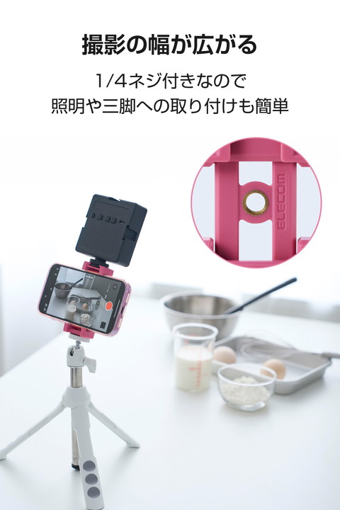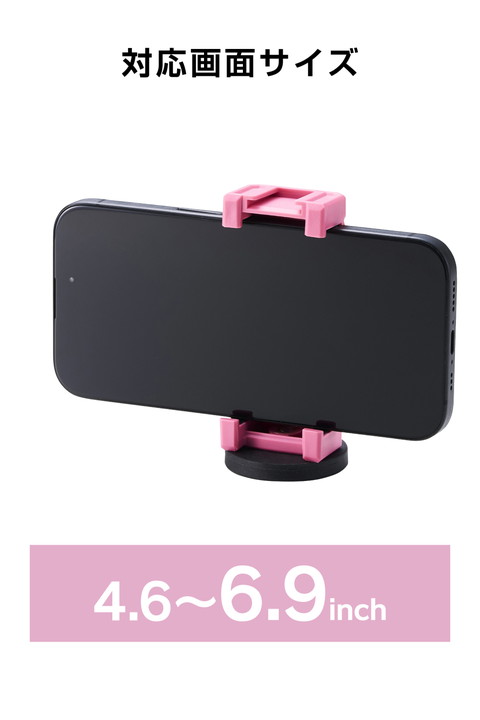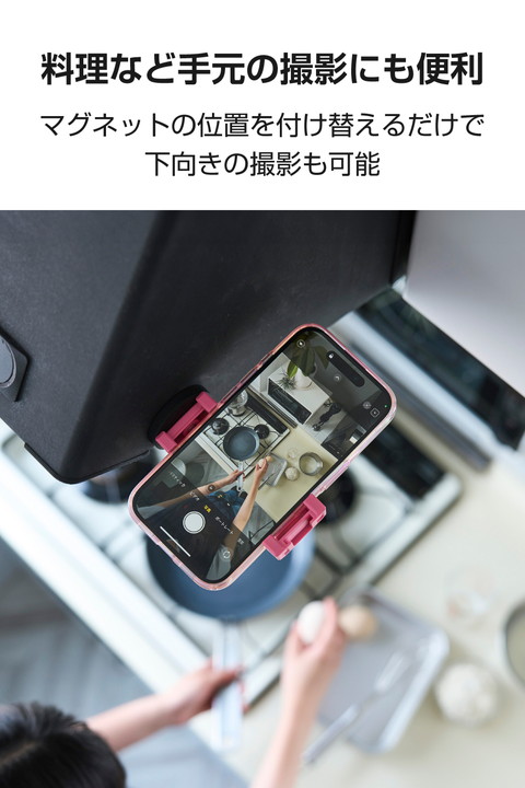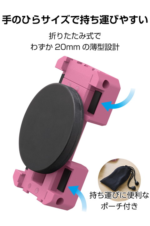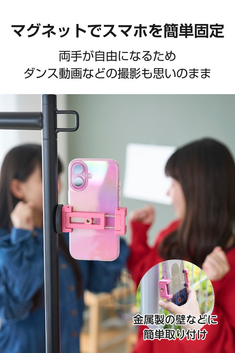 思い通りに撮影を楽しもう!金属製の壁などにスマートフォンを簡単に固定できる、マグネット式スマホスタンド”モバピタselfie”です。両手が自由になるため、自撮りはもちろん、ダンス動画やポーズ写真の撮影にもぴったり。小型&薄型設計で持ち運びやすく、小さなバッグにもすっきり収納できます。![]() ■金属製の壁などにスマートフォンを簡単に固定可能。すぐに撮影できて、使用後の取り外しもスムーズです。 ■両手が自由になるため、撮影も思いのまま。自撮りはもちろん、ダンス動画や全身を写した写真撮影、さまざまなポーズでの撮影にもぴったりです。 ■折りたたみ式で、わずか20mmの薄型設計。手のひらサイズで持ち運びやすく、小さなバッグにもすっきり収納できます。 ■スマートフォンをしっかり挟むホルダータイプで、4.6〜6.9インチのスマートフォンに対応しています。 ■マグネットの位置を下に付け替えるだけで、下向きの撮影も可能。料理やハンドメイドなど手元の撮影にも便利です。 ■1/4ネジ付きなので、照明や三脚への取り付けも簡単。撮影スタイルの幅が広がります。 ■ホルダー部とマグネット部はやわらかいゴム製なので、壁や端末を傷つけずにしっかり固定できます。 ■持ち運びに便利な、収納ポーチが付属しています。 ■※濡れたまま放置すると、色落ちや色移りの原因となる場合がありますのでご注意ください。 ■自社環境認定基準を1つ以上満たし、『THINK ECOLOGY』マークを表示した製品です。 ■廃棄物削減に取り組み、製品に同梱する取扱説明書等をペーパーレス化した製品です。 ![]() ■材質:ABS、ゴム、磁石 ■外形寸法:W約43mm×D約20mm×H約68mm ※突起部除く ■重量:約65g ■カラー:ピンク(スマホホルダー) ■対応機種:4.6〜6.9インチの各種スマートフォン(ホルダー挟み幅:約85mm) ■内容物:スマホホルダー、収納ポーチ |