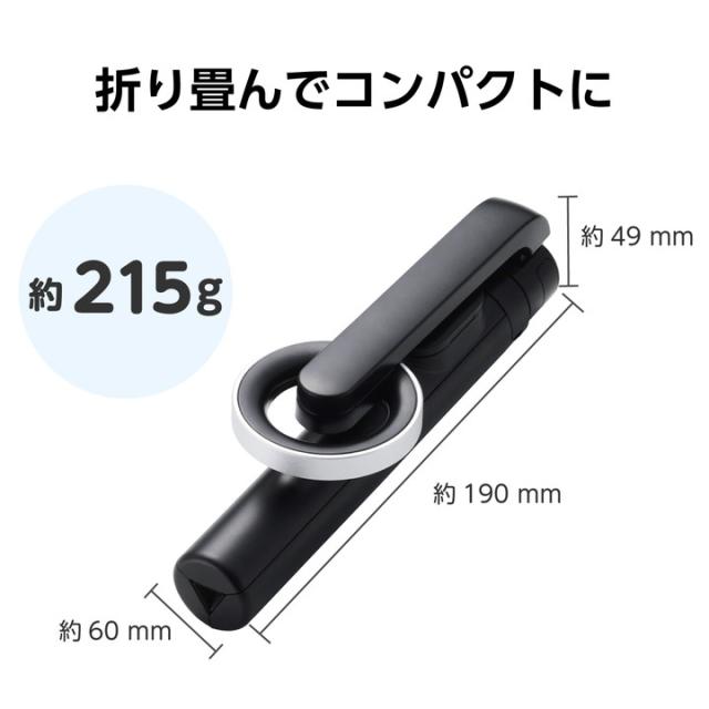 広い場所での撮影や全身撮影におすすめ。自撮り棒としても使える2Way設計のスマートフォン用三脚です。マグネット式で着脱も簡単。Bluetooth(R)接続で離れた場所からスマホカメラのシャッターを切れるワイヤレスリモコンが付いています。![]() ■脚を収納すると自撮り棒としても使用できる2Way設計です。 ■持ち運びしやすく、手軽に全身撮影や広い場所での撮影が可能です。 ■スマートフォンをお好みの角度・位置で固定可能。どんなシーンでも理想的なアングルで撮影ができます。 ■マグネットで簡単にスマートフォンの着脱が可能。動画などを撮ったあと、すぐに確認ができます。 ■付属のメタルプレートをスマホケースや端末に貼り付けることで、MagSafe非対応の機種でも使えます。 ■※使用するケースの材質、厚みによっては対応できない場合がありますのでご了承ください。 ■Bluetooth(R)接続で離れた場所からスマートフォンカメラのシャッターを切れるワイヤレスリモコンが付いています。 ■Bluetooth5.0に対応し、Bluetooth搭載のiPhone、Android端末で使用可能です。 ■自撮り棒として使用する際は、約860mmまで伸ばせるため、手持ちで撮影するよりも広範囲の写真や動画が撮れます。 ■※重いスマートフォンをご使用になる場合は、安定しない場合があります。その際は高さを低く調整してお使いください。 ■グリップ部分を開くことで三脚として使用でき、高さ約340mmから約970mmまで伸縮可能。お好みの高さに調整できます。 ■ワイヤレスリモコン動作確認用のボタン電池が付属しています。 ■※Bluetooth搭載機器でも一部ワイヤレスリモコンをご使用いただけない機種があります。対応機種情報をご確認ください。 ■※端末やソフトウェアにより写真や動画の撮影ができない場合があるため、ご注意ください。 ■自社環境認定基準を1つ以上満たし、『THINK ECOLOGY』マークを表示した製品です。 ■環境保全に取り組み、製品の包装容器が紙・ダンボール・ポリ袋のみで構成されている製品です。 ![]() ■材質:三脚:ステンレス・ABS、リモコン:ABS、メタルプレート:鉄 ■外形寸法:W約60mm×D約49mm×H約190mm ■最大地上高:約970mm(三脚として使用時) ■最低地上高:約340mm(三脚として使用時) ■最大アーム長:約860mm(自撮り棒として使用時) ■重量:約215g ■カラー:ブラック ■対応機種:MagSafe対応iPhone ※磁力装着できない機種は、付属のメタルプレートを機器本体の背面に貼り付けることでご使用いただけます。 ※ケースの材質、厚みなどによって対応できない場合がありますので、ご了承ください。 ■内容物:マグネット三脚、リモコン、メタルプレート、ボタン電池(動作確認用)、説明書(保証規定) ■Bluetooth適合規格:Bluetooth(R) 5.0 ■プロファイル:HOGP(HID over GATT Profile) ■電波周波数:2.4GHz帯 ■電波到達距離:最大半径:約10m(障害物がない場合) ■使用電池:CR1632 ■連続動作時間:約40時間 ■連続待機日数:約180日 ■想定使用可能日数:約133日 ※1日100回撮影ボタンを押した場合 ■保証期間:1年間 |