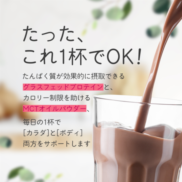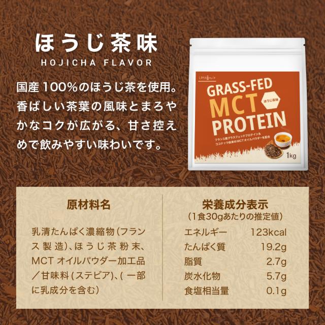ほうじ茶味:乳清たんぱく濃縮物(フランス製造)、ほうじ茶粉末、MCTオイルパウダー加工品/甘味料(ステビア)(原材料の一部に乳製品を含む)