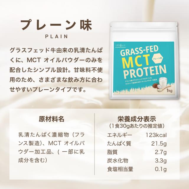 プレーン味:乳清たんぱく濃縮物(フランス製造)、MCTオイルパウダー加工品、(一部に乳成分を含む)