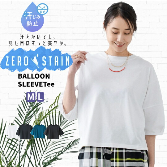 ZERO STAIN 汗染み 目立ちにくい ソデバルーン Tシャツ 汗 対策 ゼロステイン 汗じみ 防止 レディース UV 女性 トップス カットソー おしゃれ 吸水速乾 人気 無地 シンプル 機能 tシャツ 快適 撥水加工 UVカット 防汚加工 紫外線防止