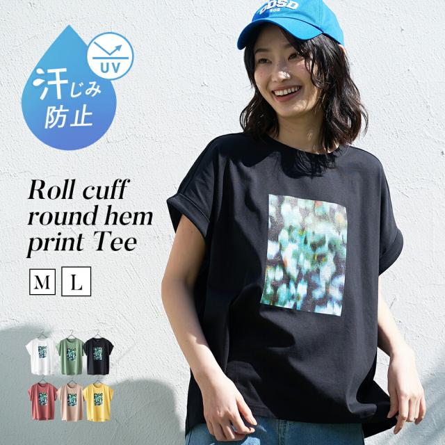 ZEROSTAIN ゼロステイン ロールカフ ラウンドヘム プリント Tシャツ レディース 女性 トップス 汗染み防止 おしゃれ 吸水速乾 人気 無地 シンプル 機能 tシャツ 快適 撥水加工 UVカット 防汚加工 紫外線防止