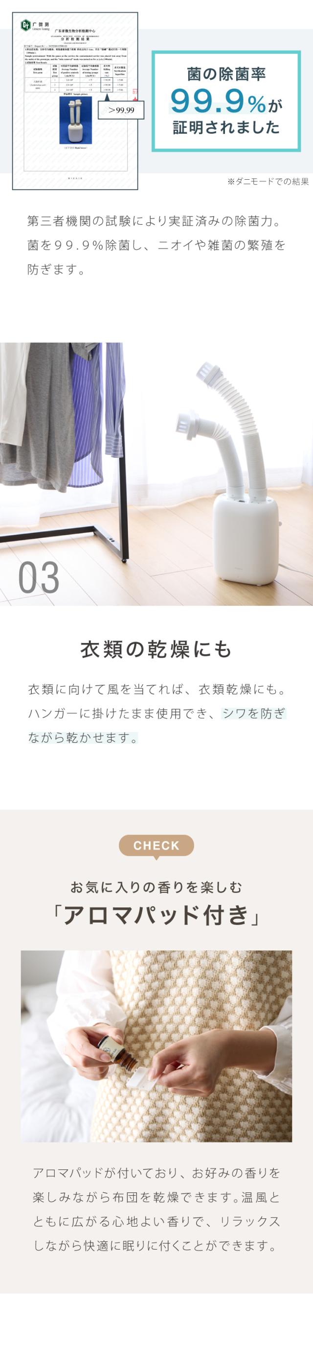 高温風でダニやカビを効果的に除去し、花粉も軽減。アレルギー対策にも最適です。