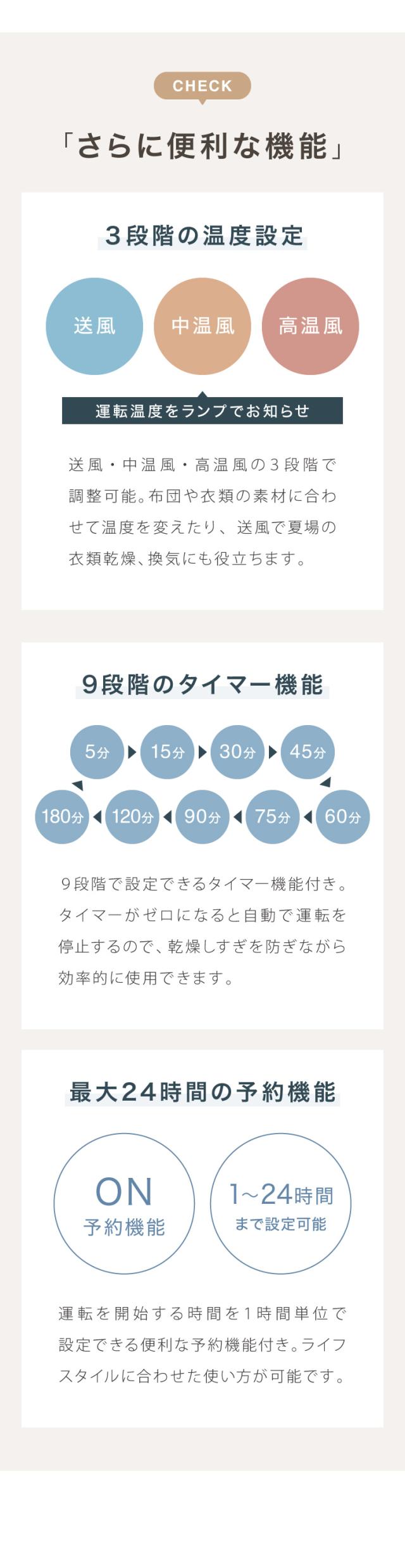 低温・中温・高温の3段階で調整可能。布団や衣類の素材に合わせた乾燥ができます。