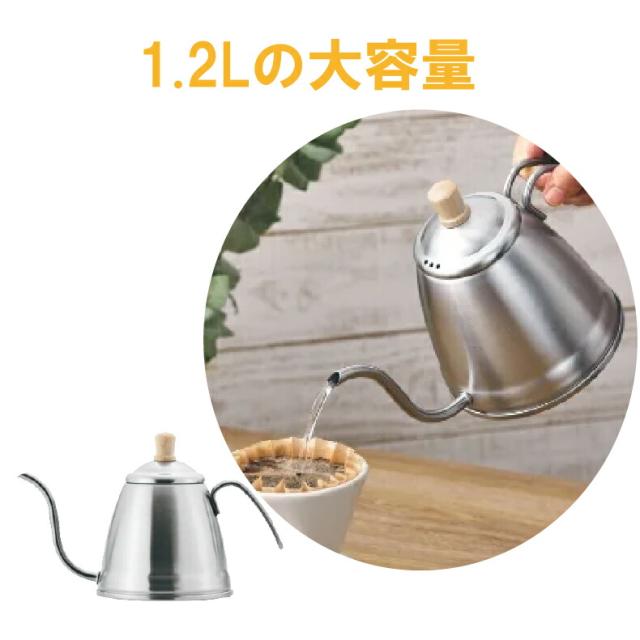 このコーヒードリップポットは約1.2リットルの満水容量を持ち、一度にたくさんのコーヒーを淹れることができます。家族や友人との集まりに最適です。