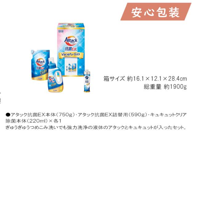 』 ●アタック抗菌EX本体(750g)・アタック抗菌EX詰替用(590g)・キュキュットクリア除菌本体(220ml)×各1 ぎゅうぎゅうつめこみ洗いでも強力洗浄の液体のアタックとキュキュットが入ったセット。 箱サイズ 約16.1×12.1×28.4cm 総重量 約1900g ■さまざまなギフトアイテムをご用意しております。 お気軽にお問い合わせください。 内祝 内祝い お祝い返し ウェディングギフト ブライダルギフト 引き出物 引出物 結婚引き出物 結婚引出物 結婚内祝い 出産内祝い 命名内祝い 入園内祝い 入学内祝い 卒園内祝い 卒業内祝い 就職内祝い 新築内祝い 引越し内祝い 快気内祝い 開店内祝い 二次会 披露宴 お祝い 御祝 結婚式 結婚祝い 出産祝い 初節句 七五三 入園祝い 入学祝い 卒園祝い 卒業祝い 成人式 就職祝い 昇進祝い 新築祝い 上棟祝い 引っ越し祝い 引越し祝い 開店祝い 退職祝い 快気祝い 全快祝い 初老祝い 還暦祝い 古稀祝い 喜寿祝い 傘寿祝い 米寿祝い 卒寿祝い 白寿祝い 長寿祝い 金婚式 銀婚式 ダイヤモンド婚式 結婚記念日 ギフト ギフトセット セット 詰め合わせ 贈答品 お返し お礼 御礼 ごあいさつ ご挨拶 御挨拶 プレゼント お見舞い お見舞御礼 お餞別 引越し 引越しご挨拶 記念日 誕生日 父の日 母の日 敬老の日 記念品 卒業記念品 定年退職記念品 ゴルフコンペ コンペ景品 景品 賞品 粗品 お香典返し 香典返し 志 満中陰志 弔事 会葬御礼 法要 法要引き出物 法要引出物 法事 法事引き出物 法事引出物 忌明け 四十九日 七七日忌明け志 一周忌 三回忌 回忌法要 偲び草 粗供養 初盆 供物 お供え お中元 御中元 お歳暮 御歳暮 お年賀 御年賀 残暑見舞い 年始挨拶 話題 のし無料 メッセージカード無料 ラッピング無料 手提げ袋無料 大量注文