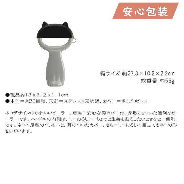 ネコデザインのかわいいピーラー。収納に安心な刃カバー付。芽取りもついた便利なピーラーです。ハンドルの内側は、ミニおろしに。ちょっと生姜をおろしたいときなどに便利です。ネコの足型のハンドルと、耳のついたカバー、さらにミニおろしの目立てもネコの形をしています。