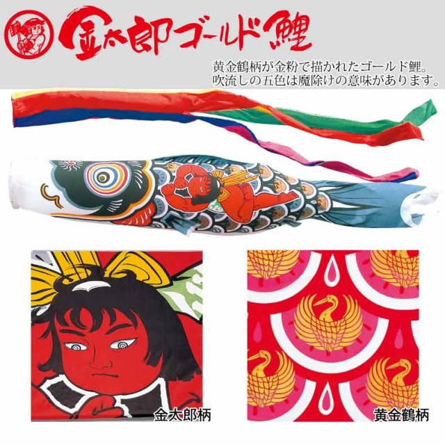 鱗に金粉で黄金鶴柄を配したまさにゴールド鯉。両面にたくましい金太郎を描いた金太郎ゴールド鯉です。吹流しには魔除けの意味をもつ五色を用いた五色吹流しをセットしています。