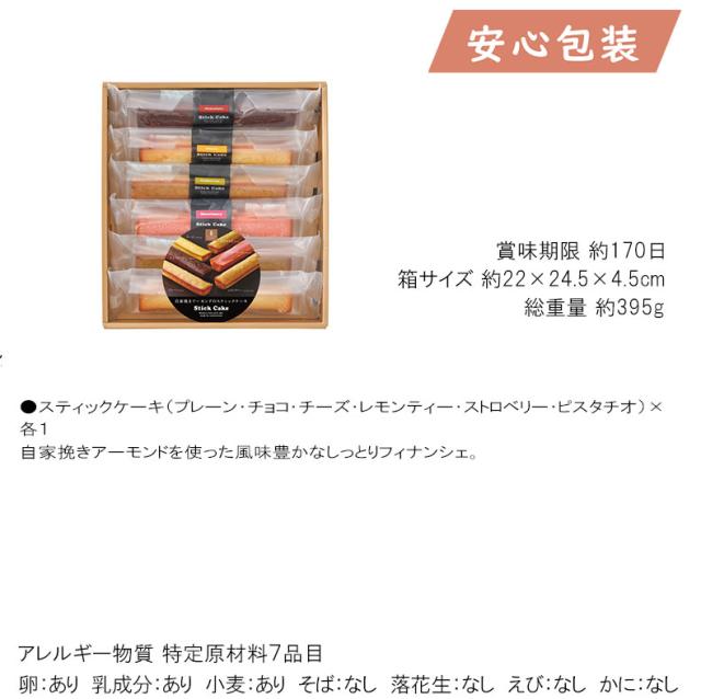 』 ●スティックケーキ(プレーン・チョコ・チーズ・レモンティー・ストロベリー・ピスタチオ)×各1 自家挽きアーモンドを使った風味豊かなしっとりフィナンシェ。 箱サイズ 約22×24.5×4.5cm 総重量 約395g 賞味期限 約170日 アレルギー物質 特定原材料7品目 卵:あり 乳成分:あり 小麦:あり そば:なし 落花生:なし えび:なし かに:なし ■さまざまなギフトアイテムをご用意しております。 お気軽にお問い合わせください。 内祝 内祝い お祝い返し ウェディングギフト ブライダルギフト 引き出物 引出物 結婚引き出物 結婚引出物 結婚内祝い 出産内祝い 命名内祝い 入園内祝い 入学内祝い 卒園内祝い 卒業内祝い 就職内祝い 新築内祝い 引越し内祝い 快気内祝い 開店内祝い 二次会 披露宴 お祝い 御祝 結婚式 結婚祝い 出産祝い 初節句 七五三 入園祝い 入学祝い 卒園祝い 卒業祝い 成人式 就職祝い 昇進祝い 新築祝い 上棟祝い 引っ越し祝い 引越し祝い 開店祝い 退職祝い 快気祝い 全快祝い 初老祝い 還暦祝い 古稀祝い 喜寿祝い 傘寿祝い 米寿祝い 卒寿祝い 白寿祝い 長寿祝い 金婚式 銀婚式 ダイヤモンド婚式 結婚記念日 ギフト ギフトセット セット 詰め合わせ 贈答品 お返し お礼 御礼 ごあいさつ ご挨拶 御挨拶 プレゼント お見舞い お見舞御礼 お餞別 引越し 引越しご挨拶 記念日 誕生日 父の日 母の日 敬老の日 記念品 卒業記念品 定年退職記念品 ゴルフコンペ コンペ景品 景品 賞品 粗品 お香典返し 香典返し 志 満中陰志 弔事 会葬御礼 法要 法要引き出物 法要引出物 法事 法事引き出物 法事引出物 忌明け 四十九日 七七日忌明け志 一周忌 三回忌 回忌法要 偲び草 粗供養 初盆 供物 お供え お中元 御中元 お歳暮 御歳暮 お年賀 御年賀 残暑見舞い 年始挨拶 話題 のし無料 メッセージカード無料 ラッピング無料 手提げ袋無料 大量注文