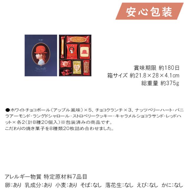 ●ホワイトチョコボール(アップル風味)×5、チョコクランチ×3、ナッツベリーハート・バニラアーモンド・ラングドシャロール・ストロベリークッキー・キャラメルショコラサンド・レッドハット×各2(計8種20個入)※包装済みの商品です。