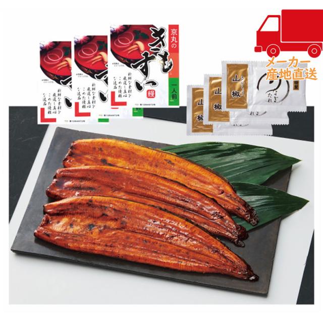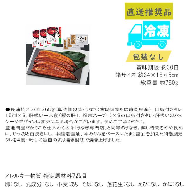 ●長蒲焼×3(計360g・真空個包装・うなぎ:宮崎県または静岡県産)、山椒付きタレ15ml×3、肝吸い一人前(鰻の肝1、粉末スープ1)×3※山椒付きタレ・肝吸いのパッケージデザインは変更になる場合がございます。予めご了承ください。