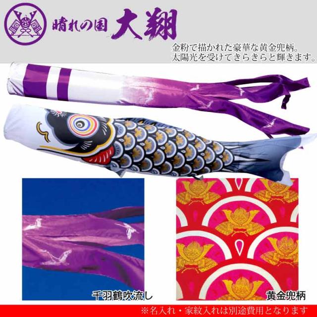光沢あるポリエステルシルキーブライト生地を使用し、鱗に金粉を用いて黄金兜柄を描きあげた豪華な鯉のぼりです。吹流しはポリエステルシルキーブライト生地を使用し、縁起の良い鶴を描いた「千羽鶴吹流し」をセットしています。
