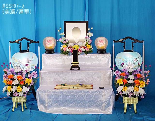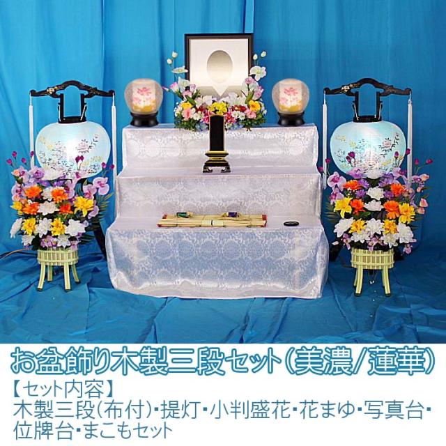 おすすめ お盆飾り木製三段セット(美濃/蓮華)#SS107-A 推奨ご奉仕特価 (代引き不可商品)【セット内容】木製三段(布付)・提灯・小判盛花・花まゆ・写真台・位牌台・まこもセット、おすすめ