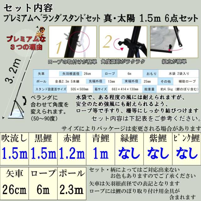 鯉のぼり こいのぼり ベランダ おしゃれ お洒落 マンション ベランダ用 屋外 プレミアムベランタ゛スタンドセット 真・太陽 1.5m 6点セット オシャレ