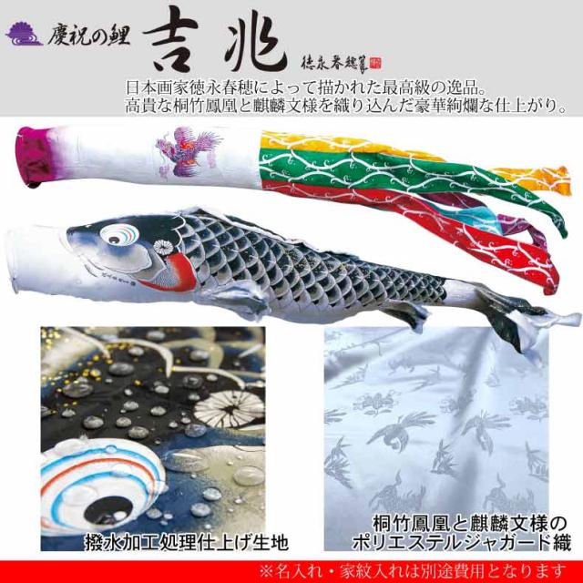 『慶祝の鯉 吉兆』は日本画家 徳永春穂によって描かれ、製作した最高級の逸品です。絹の風合いのポリエステルに、歴代の貴族に好んで用いられた、高貴な桐竹鳳凰と麒麟文様を織り込んだジャガード織の生地。伝統の手染め友禅ぼかしの技法を用い染め上げ、全体にアルミ金箔をちりばめた豪華絢爛な仕上がりです。