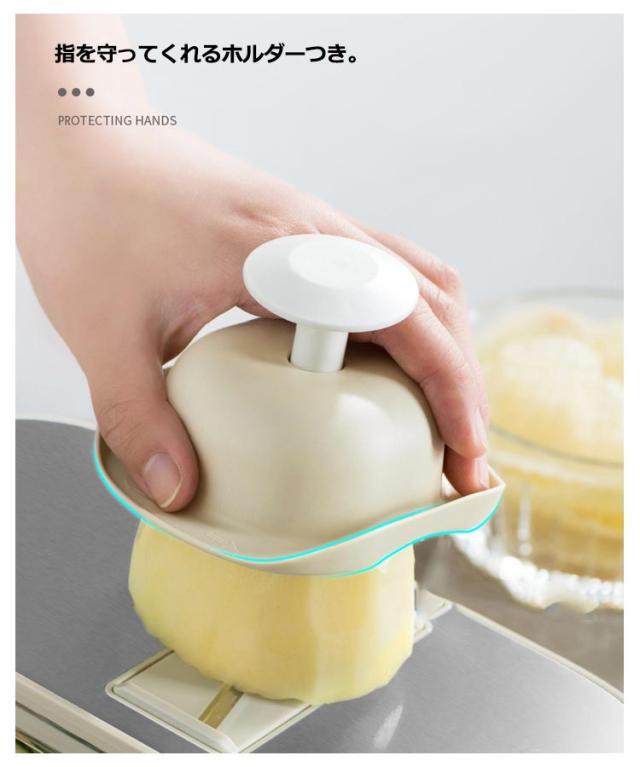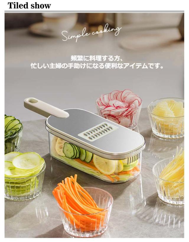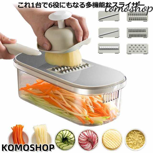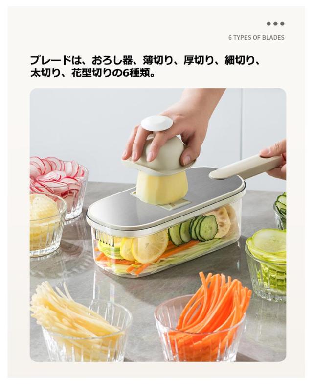 | これ1台で6役にもなる多機能なスライサー。 頻繁に料理する方、忙しい主婦の手助けになる便利なアイテムです。 指を守ってくれるホルダーつき。 ブレードは、おろし器、薄切り、厚切り、細切り、太切り、花型切りの6種類。 簡単に差し込むだけなので、めんどうくさがりの人でも刃の取り替えがラクラク。 調理時間を大幅に減らすことができ、面倒な工程が減るだけでなく、包丁だけでは難しい繊細な作業が可能になり、料理の幅が広がります。 そのため、忙しい主婦から料理初心者まで、自炊をするすべての方におすすめです。 | |