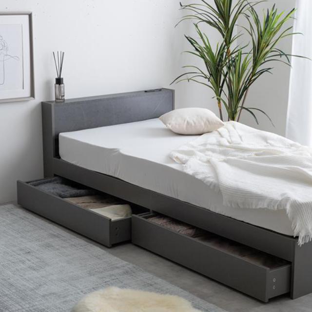 ストーン柄が高級感漂う宮棚&コンセント付き引き出し収納ベッド。