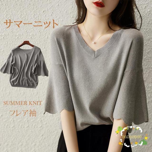 サマーニット ニット Tシャツ カットソー 半袖 Vネック フレア袖 レディース トップス 半袖ニット シンプル 涼しい 無地 冷房対策