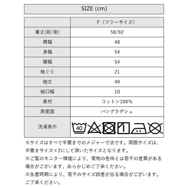 ■サイズ:[Fサイズ]着丈(前/後):58/62cm、肩幅:48cm、身幅:54cm、裾幅:54cm、袖ぐり:21cm、袖丈:49cm、袖幅:18.5cm、袖口幅:10cm
