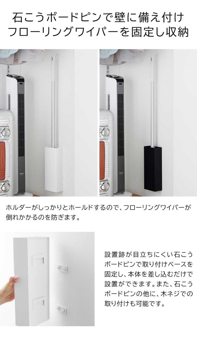 フローリングワイパーを浮かせて収納できるシンプルでスリムなホルダー。跡が目立ちにくい石こうボードピンで取り付け可能です。置き場所に困り、出しっぱなしのフローリングワイパーをホルダーへ差し込むだけで、生活感を隠せてスッキリした空間になります。ホルダーは浮かせて設置するので床掃除の邪魔にならず、使いたい時にすぐに取り出しサッと床拭きできます。ホルダーがしっかりとホールドするので、フローリングワイパーが倒れかかるのを防ぎます。
