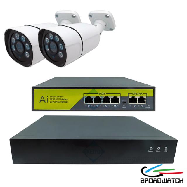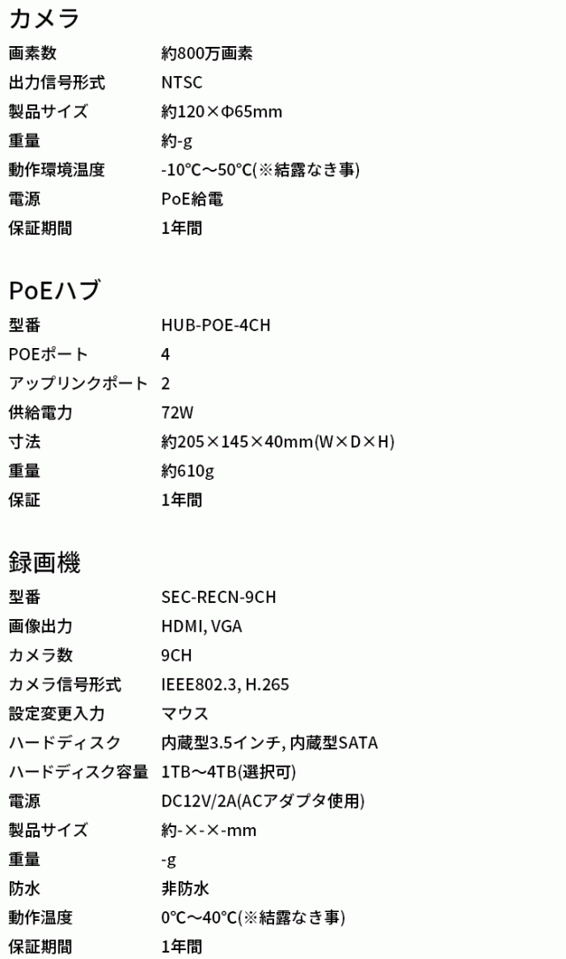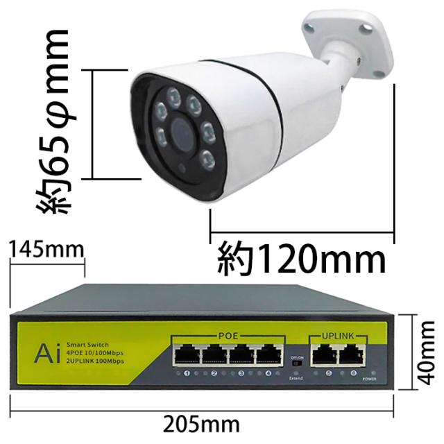 SEC-N-2Kは、800万画素屋外用ワンケーブルバレット型防犯カメラ2台と、リンクポート付4ポートハブ1台、HDD録画機1台のセット商品です。