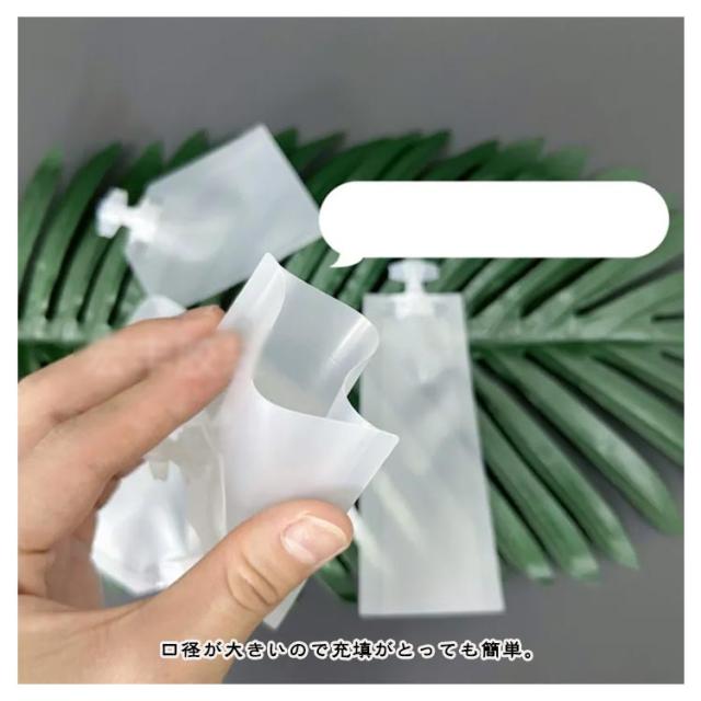 | 旅の途中で必要なコスメや液体を、便利なトラベル用小分けボトルセットで手軽に携帯できるボトルの100枚セットです。 パウチタイプなので絞りやすく排出もスムーズで最後までキレイに使い切ることができます。 口径が大きいので充填がとっても簡単。 密閉力もしっかりしており、中身も簡単には漏れない仕様。 4サイズあるので、シャンプー入れ等いろんな用途にお使いいただけます。 普段使いから、旅行、アウトドアまで幅広くお使いいただける便利なアイテムです。 | |