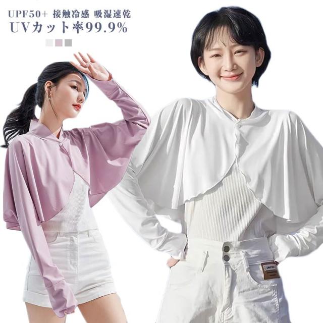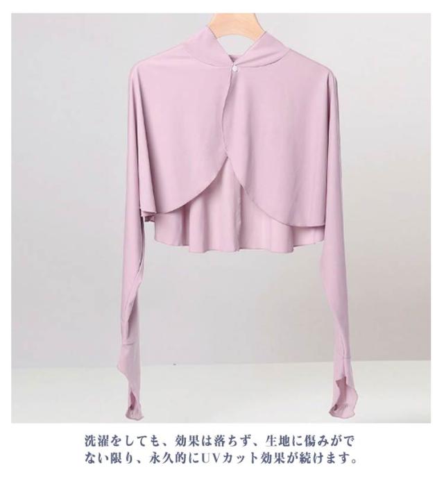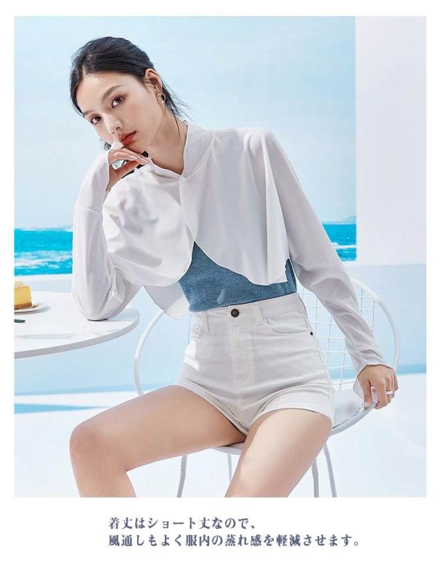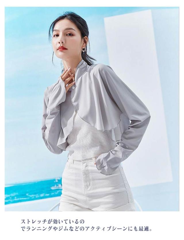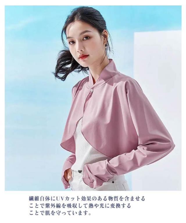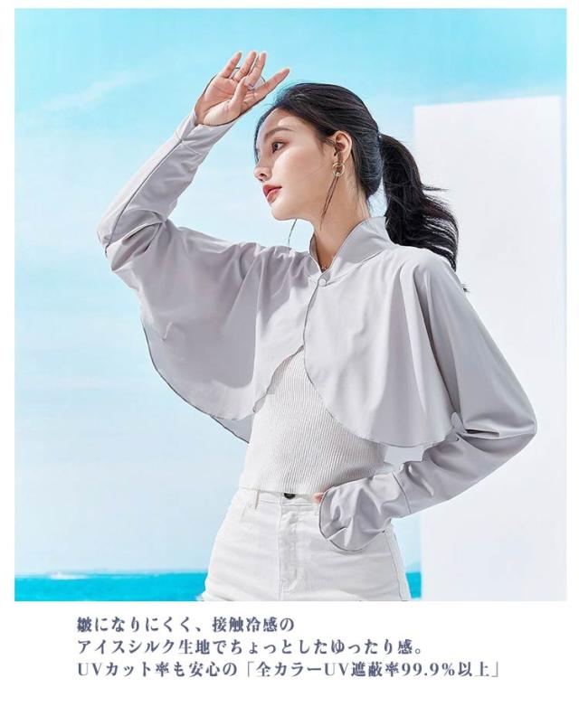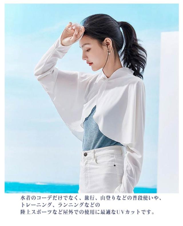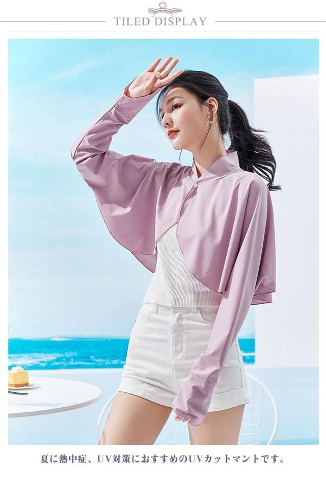 マント ラッシュガード UV ショート丈 ケープ UVカット UPF50+ ポンチョ パーカー レディース 可愛い 着る 長袖 ライトアウター 日よけ 冷感 立ち襟 カーディガン アームカバー ゆったり 指穴 ボタン トップス 体型カバー ボレロ 吸汗 速乾