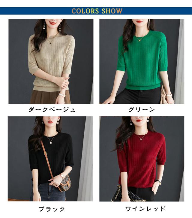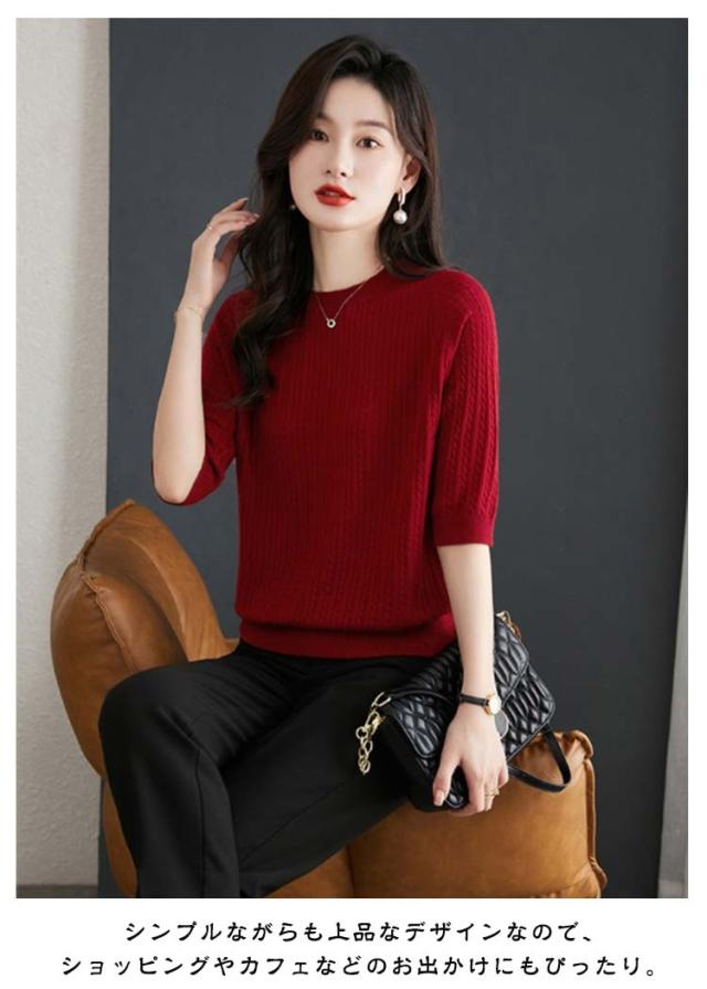 ケーブル編み 薄手 半袖ニット レディース プルオーバー トップス 半袖 カットソー 着回し 透けない 半袖ニット ストレッチ 高見え シンプル 軽い クルーネック フリーサイズ 通気性