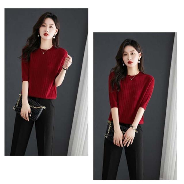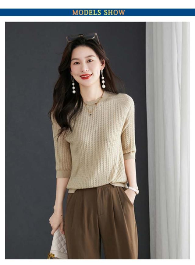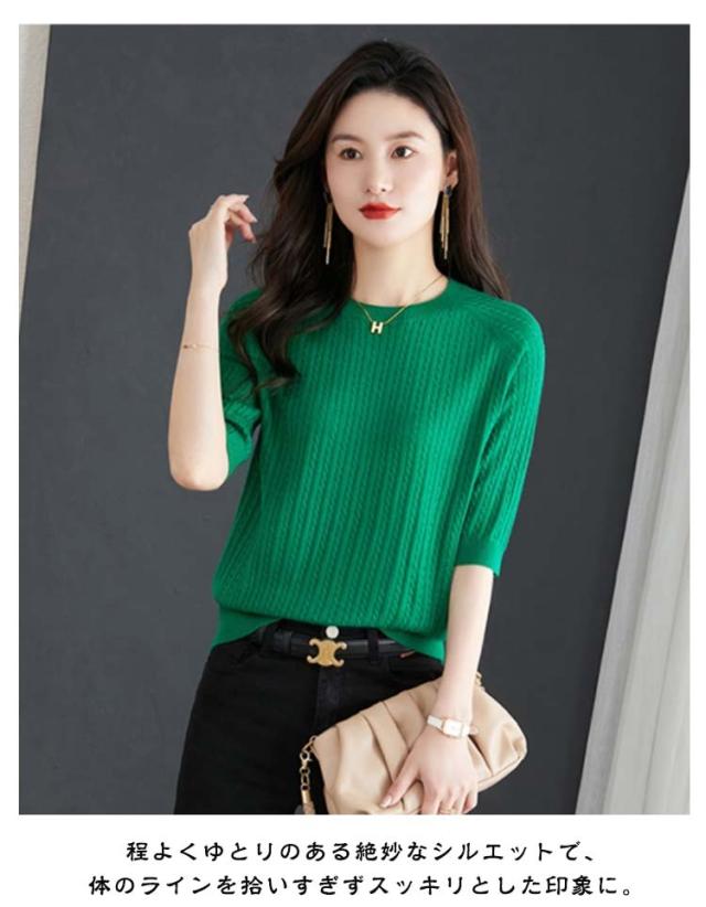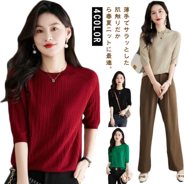 レディース 薄手 サマーニット 半袖 トップス ストレッチ 半袖ニット カットソー ケーブル編み シンプル 着回し プルオーバー 高見え 透けない 軽い 半袖ニット フリーサイズ 通気性