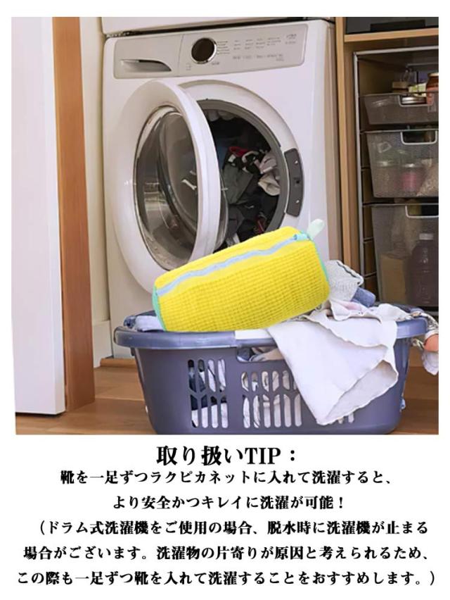 | 大変だった手洗いは卒業!楽なのに手で洗濯したようにキレイに洗える優秀アイテム。 内部は1万本以上のふわふわ繊維ブラシでできており、靴を傷めず優しく洗い上げます。 厚みのあるサイドメッシュは衝撃吸収に優れていて、靴の傷みや洗濯機へのダメージを軽減。 そのまま吊るして乾かせるループ付き。 取り扱いTIP: 靴を一足ずつラクピカネットに入れて洗濯すると、より安全かつキレイに洗濯が可能! (ドラム式洗濯機をご使用の場合、脱水時に洗濯機が止まる場合がございます。洗濯物の片寄りが原因と考えられるため、この際も一足ずつ靴を入れて洗濯することをおすすめします。) =ファスナーを固定カバーに通し、しっかり上まで閉めることで、より安定的な洗濯が可能に! ラクピカネットに靴を入れる前に、ぬるま湯に重曹を溶かし、30分間つけおきがおすすめ!長くつけておく分、汚れの分解が進みます | |