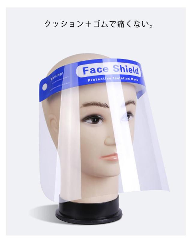 | 高透明&軽量 フェイスシールド 100セット 空気中の飛沫、ホコリや花粉が鼻・口・目から侵入するリスクを軽減します。 【高透明シールド】曇り防止処理を行ったシールドでクリアな視界を確保。 クッション+ゴムで痛くない。 アルコール消毒・水洗いOK。 ※保護フィルムが両面についています剥がしてからお使いください | |