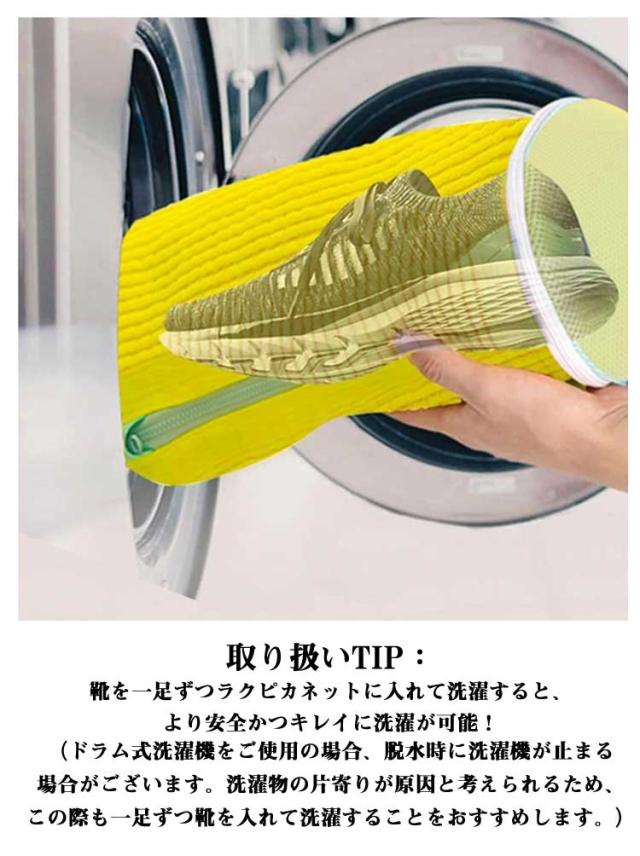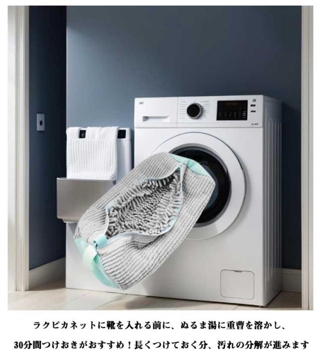 | 大変だった手洗いは卒業!楽なのに手で洗濯したようにキレイに洗える優秀アイテム。 内部は1万本以上のふわふわ繊維ブラシでできており、靴を傷めず優しく洗い上げます。 厚みのあるサイドメッシュは衝撃吸収に優れていて、靴の傷みや洗濯機へのダメージを軽減。 そのまま吊るして乾かせるループ付き。 取り扱いTIP: 靴を一足ずつラクピカネットに入れて洗濯すると、より安全かつキレイに洗濯が可能! (ドラム式洗濯機をご使用の場合、脱水時に洗濯機が止まる場合がございます。洗濯物の片寄りが原因と考えられるため、この際も一足ずつ靴を入れて洗濯することをおすすめします。) =ファスナーを固定カバーに通し、しっかり上まで閉めることで、より安定的な洗濯が可能に! ラクピカネットに靴を入れる前に、ぬるま湯に重曹を溶かし、30分間つけおきがおすすめ!長くつけておく分、汚れの分解が進みます | |