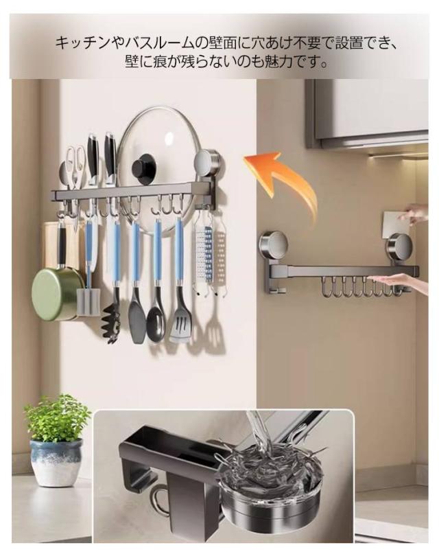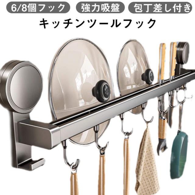 キッチンツールフック 6個フック 吸盤式 可動式フック 調理器具 壁掛けフック キッチンツールフック 40cm 30cm 強力吸盤ダブルバー 吸盤式 8個フック 穴あけ不要 キッチンツール収納 キッチンラック 鍋蓋置き 包丁差し 防水 防錆 防油 キッチンツール 壁掛け