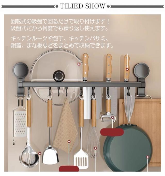 | キッチンツールフック 6/8個フック 強力吸盤 可動式フック ダブルバー 包丁差し付き 回転式の吸盤で回るだけで取り付けます!吸盤式だから何度でも繰り返し使えます。 キッチンルーツや包丁、キッチンバサミ、鍋蓋、まな板などをまとめて収納できます。 メッキを施すことでサビに強いです。 キッチンやバスルームの壁面に穴あけ不要で設置でき、壁に痕が残らないのも魅力です。 | |