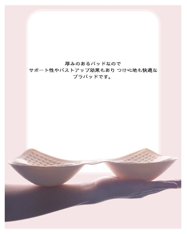 | ふわふわのパットでキレイにバストアップ。 しっかりと下からバストを持ち上げ、自然で美しいバストラインを演出します。 セパレート型と一体型でズレにくいのもうれしい。 通気性のある素材なので、柔らかくて肌触りが良い。 スポーツブラ、ブラトップなどブラカップポケット付きのインナーにご使用できます。 厚みのあるパッドなのでサポート性やバストアップ効果もあり つけ心地も快適なブラパッドです。 | |