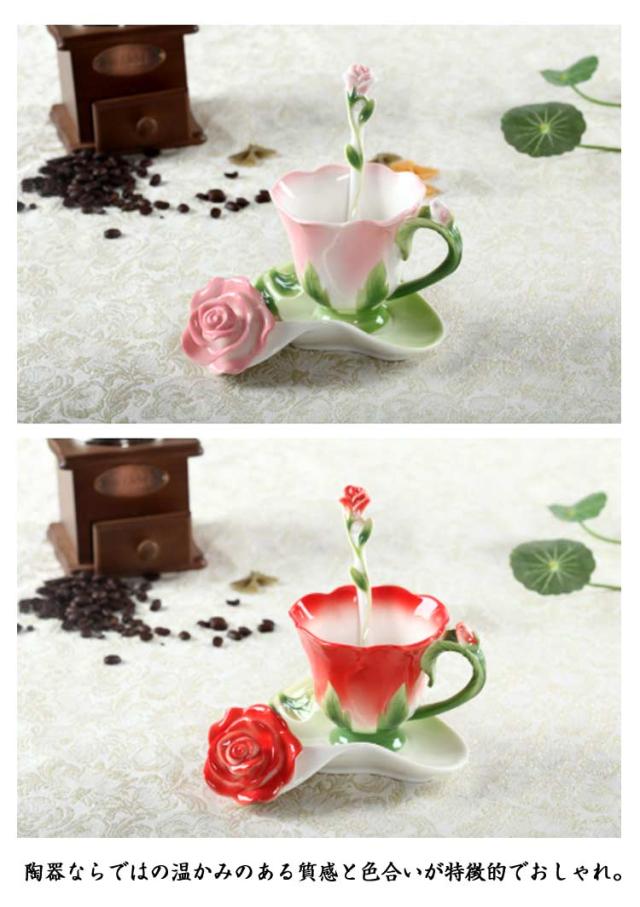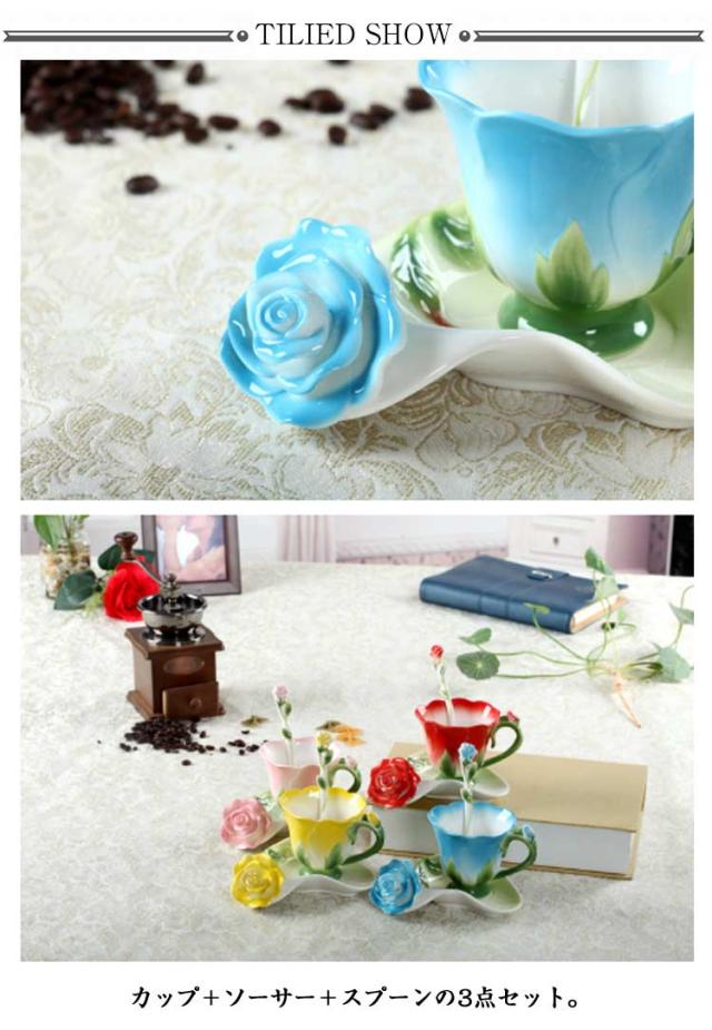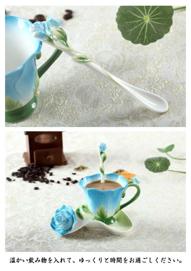 ソーサー 200ml 3点セット コップ 皿付き 彫刻 陶器 カップ マグカップ 耐熱 型 マグカップ コーヒーカップ 取手付き かわいい 湯呑み スプーン付き 花模様 花柄 ローズ 華奢 セット コーヒー ティー お茶 花型 母の日 敬老の日 誕生日 ギフト プレゼント