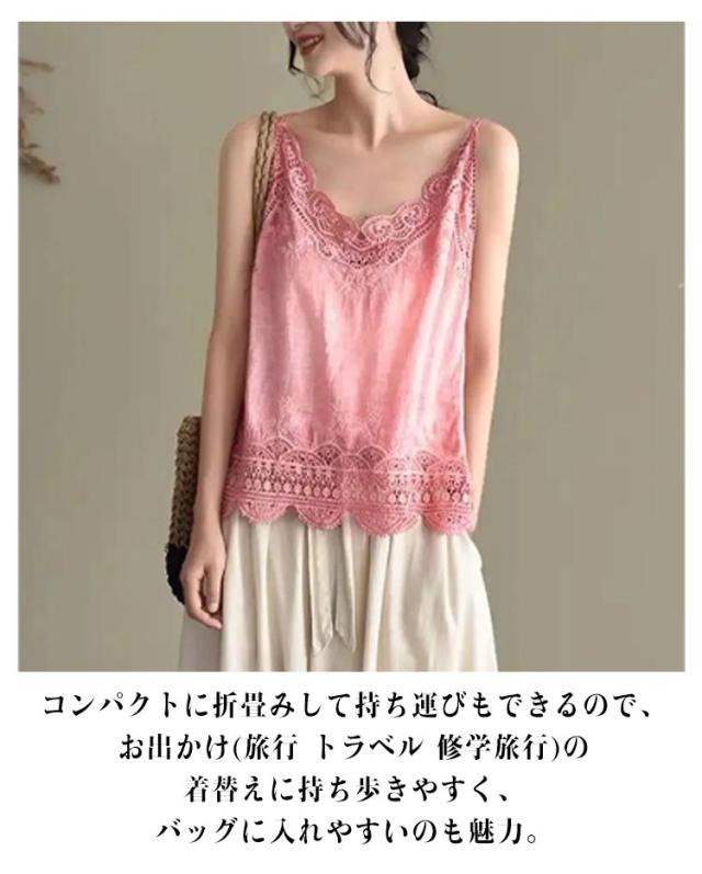 | レースをあしらった、清涼感たっぷり! ルーズなシルエットを演出するキャミソール。 通気性に優れた薄手の素材で、1枚トップスとして春夏に最適。 一枚で着ても、インナーに着てもオシャレなアイテム。 コンパクトに折畳みして持ち運びもできるので、お出かけ(旅行 トラベル 修学旅行)の着替えに持ち歩きやすく、バッグに入れやすいのも魅力。 | |