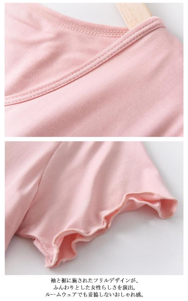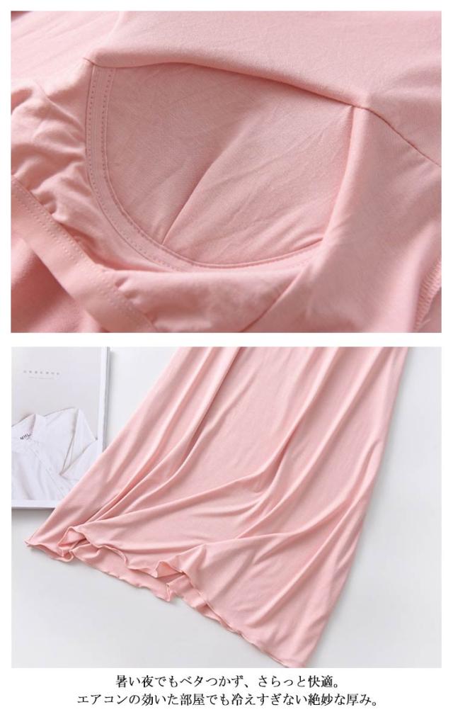 | カップ付きでブラ不要、1枚で着用OK 夏にぴったりの薄手&通気性抜群設計 胸元にパッドが内蔵されているから、面倒な下着は不要。そのまま1枚で快適に過ごせます。 とろけるような肌触りのモダール生地を使用。薄くて軽いのにしっかり高級感があり、お肌に優しく快適です。 暑い夜でもベタつかず、さらっと快適。エアコンの効いた部屋でも冷えすぎない絶妙な厚み。 袖と裾に施されたフリルデザインが、ふんわりとした女性らしさを演出。ルームウェアでも妥協しないおしゃれ感。 ゆったりシルエットで体型カバーも◎締め付け感ゼロのシルエットで、お腹やヒップを自然にカバー。 ブラもインナーも不要で、荷物を減らせて便利!軽量だから持ち運びにもぴったりです。 | |