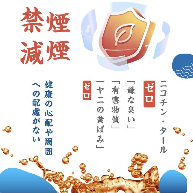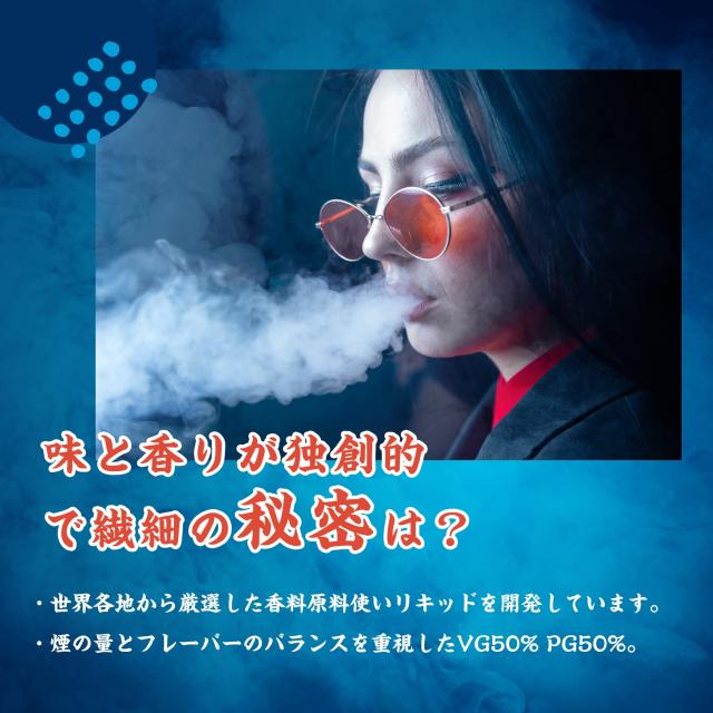 VG50%:PG50%、煙の量とフレーバーのバランスの良い比率、リキッド自体の美味しさを最大限体験できます。世界各地から厳選した香料原料を使用、ニコチン・タール無し、化学成分・有害物質は一切使用しておりません、タバコの嫌な臭い0。