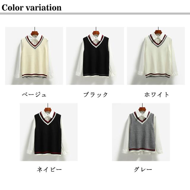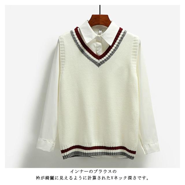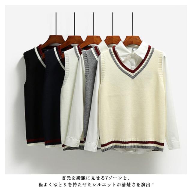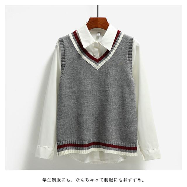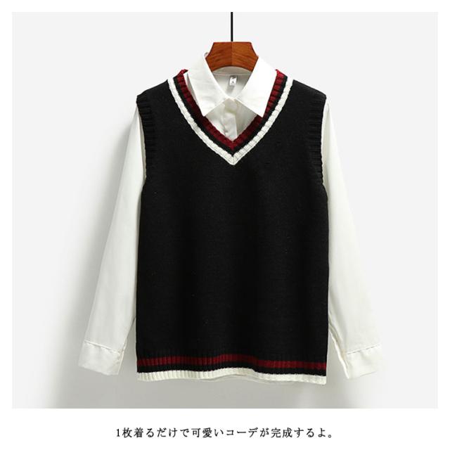 | 配色ライン+フロント部分に入ったケーブル編みがポイント 1枚着るだけで可愛いコーデが完成するよ。 学生制服にも、なんちゃって制服にもおすすめ。 インナーのブラウスの衿が綺麗に見えるように計算されたVネック深さです。 首元を綺麗に見せるVゾーンと、程よくゆとりを持たせたシルエットが清楚さを演出! | |