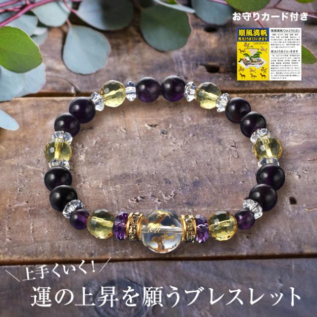九頭の馬が駆ける縁起のモチーフ「九頭馬(くずうま)」をあしらった水晶珠を中心に、アメジストや黄水晶(シトリン)をバランスよく配置したブレスレットです。