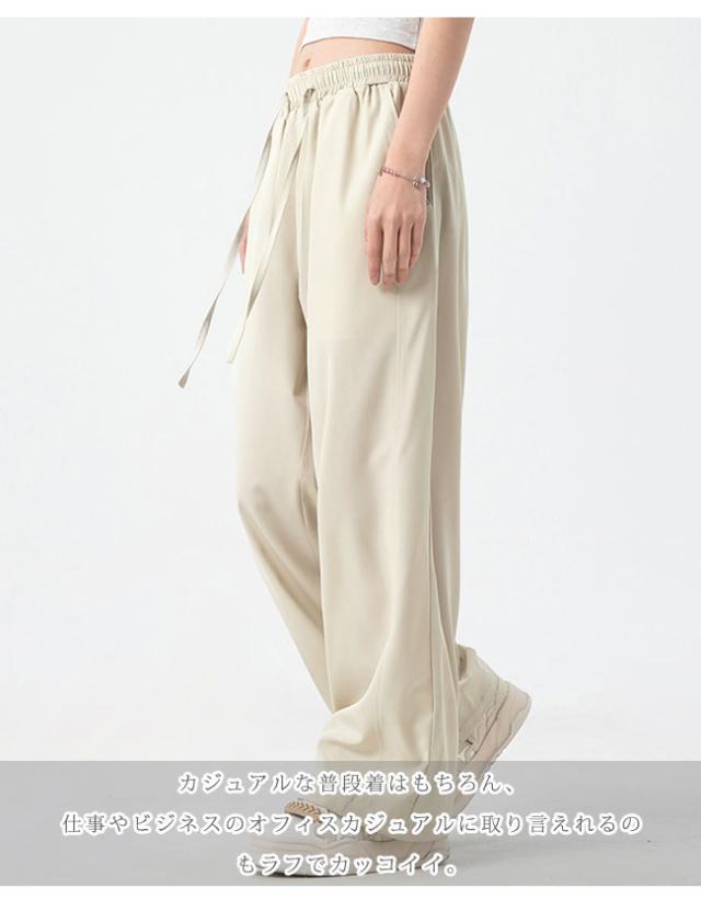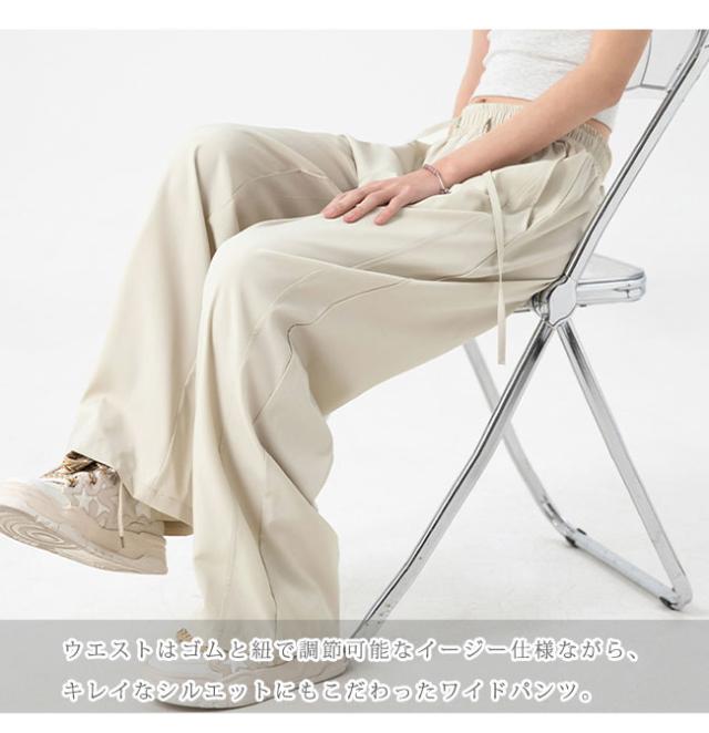 ウエストはゴムと紐で調節可能なイージー仕様ながら、キレイなシルエットにもこだわったワイドパンツ。