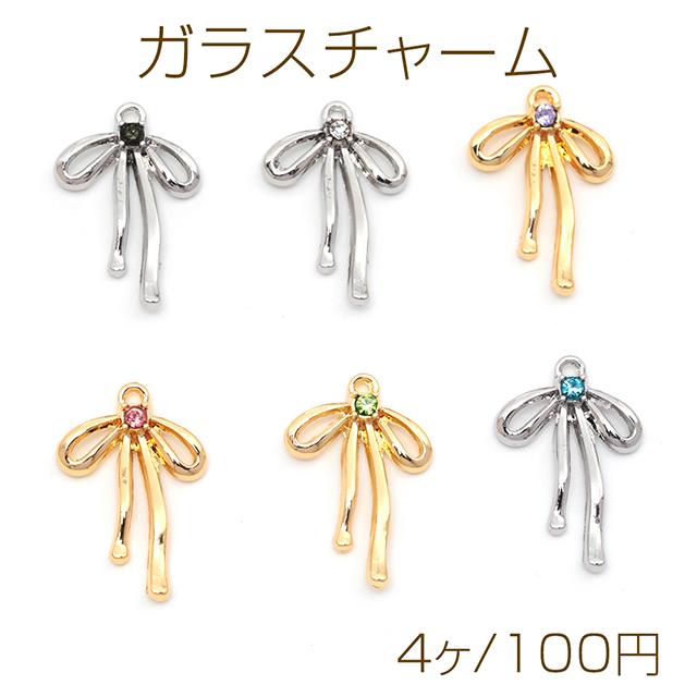 ガラスチャーム 合金製 りぼん 蝶々結び ガラスストーン付き メタルチャーム 約14×21mm(4ヶ)